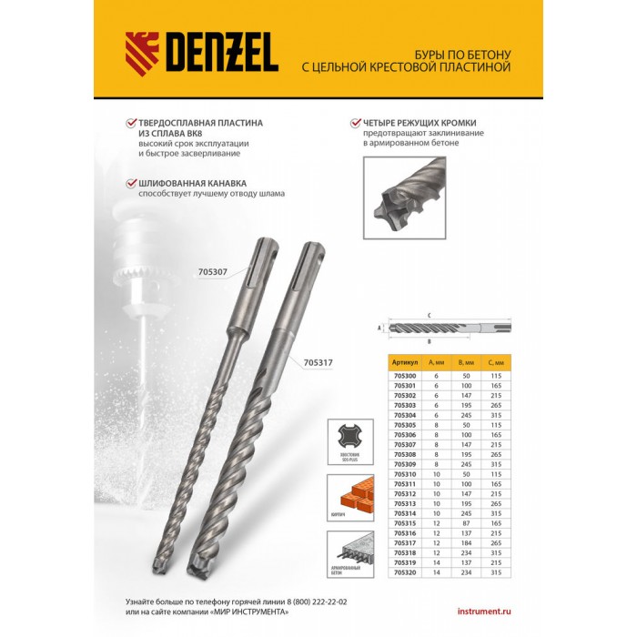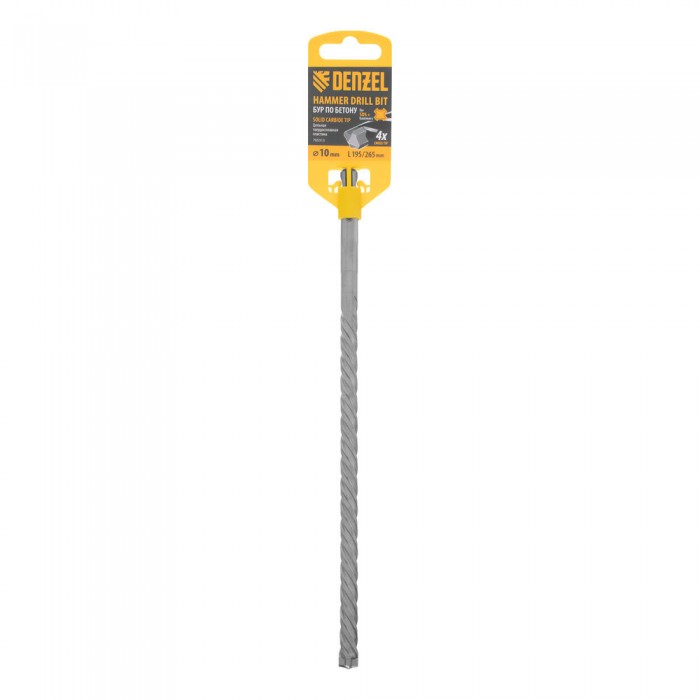 Бур по бетону, цельная крестовая пластина, 10x265 мм, SDS PLUS Denzel (705313)