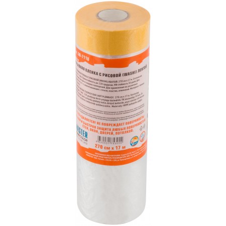Укрывная пленка с малярной лентой из тонкой рисовой бумаги (WASHI ). Для защиты от краски, пыли, грязи при проведении покрасочных, ремонтных и отделочных работ. Малярная лента: термостойкость до 120°C, УФ стойкость до 30 дней, высококачественный акриловый клей на водной основе, высокая адгезия. Для средних и больших поверхностей внутри помещений. Плотное прилегание плёнки к поверхности за счёт электростатического заряда. Толщина пленки 7 мкм.