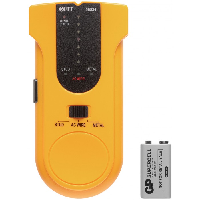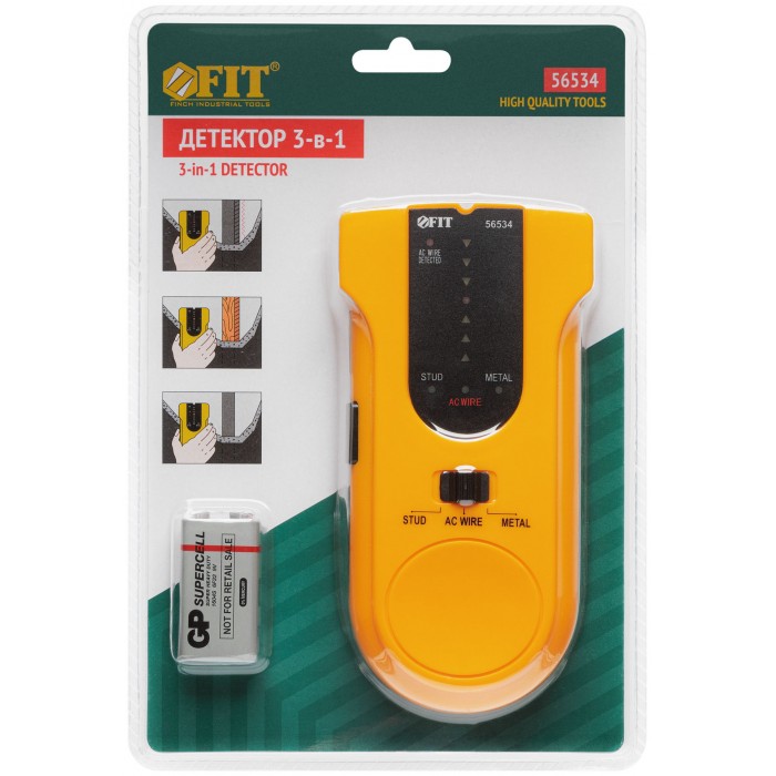 Профи. Детектор скрытой проводки, напряжения в сети, скрытых балок (в том числе и деревянных) в одном приборе. Точная локализация объекта. Источник питания: батарейка 9 V типа «Крона». Упаковка: блистер.