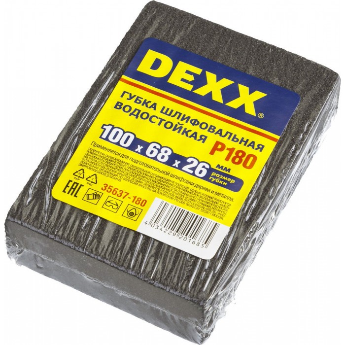 Четырехсторонняя водостойкая шлифовальная губка Р180, 100 х 68 х 26 мм DEXX 35637-180