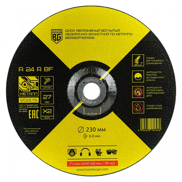 Диск абразивный вогнутый обдирочно-зачистной по металлу A24RBF (230x6.0x22.23 мм) BERGER BG1556