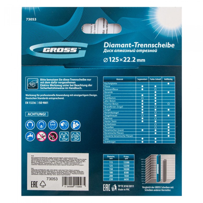 Диск алмазный, 125 х 22.2 мм, тонкий, сплошной (Jaguar) мокрая резка Gross (73053)