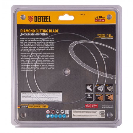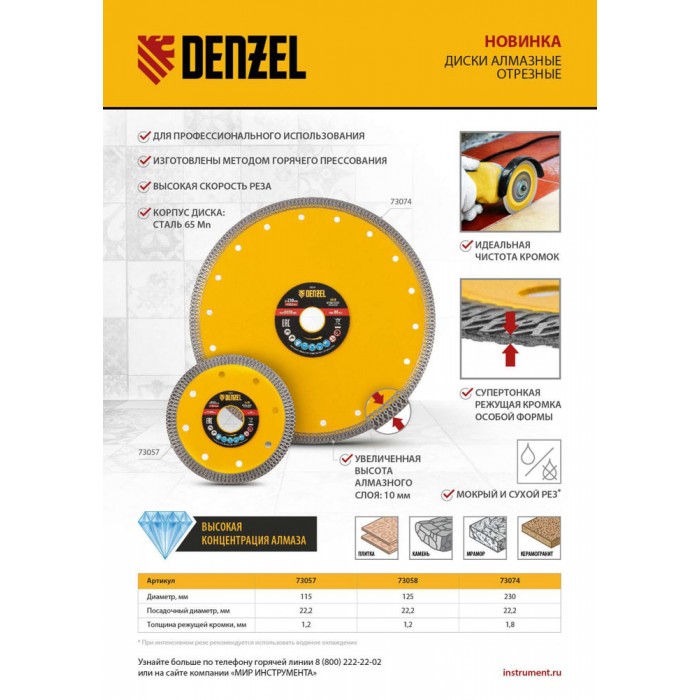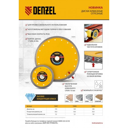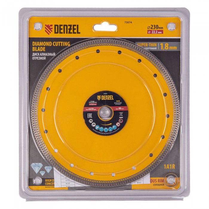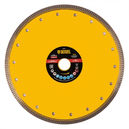 Диск алмазный отрезной 230 х 22,2мм, сплошной, супертонкий, горячий пресс, сухой/мокрый рез Denzel (73074)