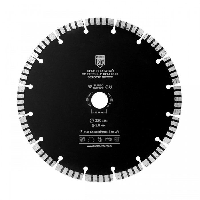 Диск алмазный отрезной по бетону и кирпичу (турбо-сегментированный, 230x2.8x22.23 мм) BERGER BG1606