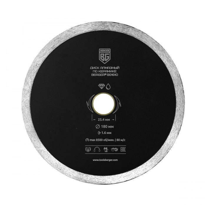 Диск алмазный отрезной по керамике (несегментный, 180x1.6x25.4 мм + адаптер 22.23 мм) BERGER BG1610