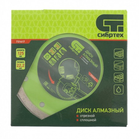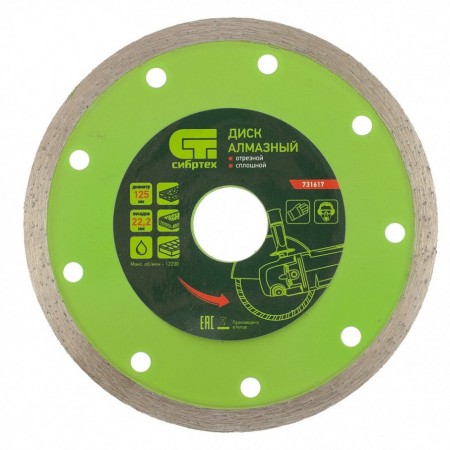 Диск алмазный, отрезной сплошной, 125 х 22.2 мм, мокрая резка Сибртех (731617)