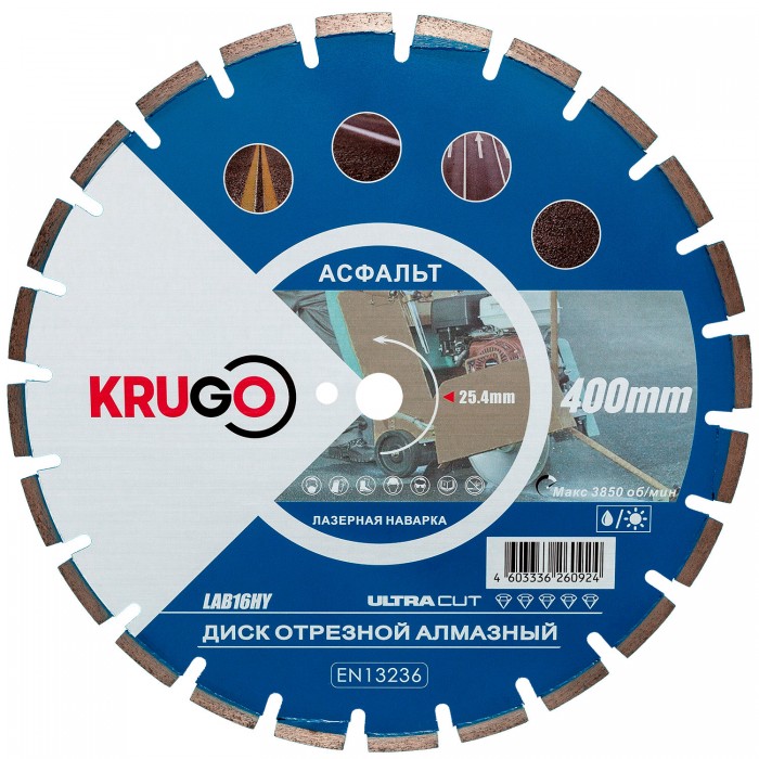 Диск алмазный сегментный по асфальту (лазерная наварка) 400x25.4x40x3.2x10/17mm KRUGO (LAB16HY)