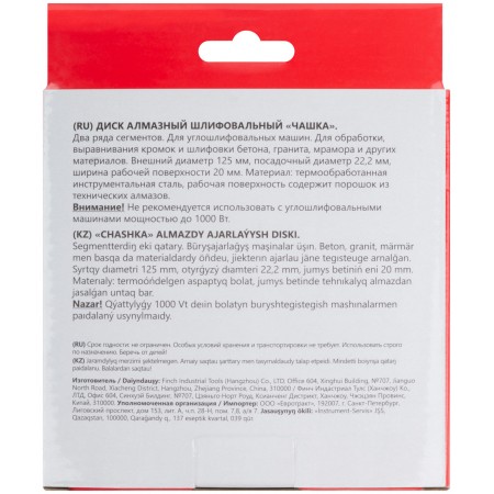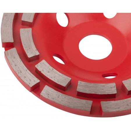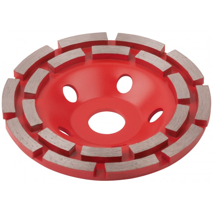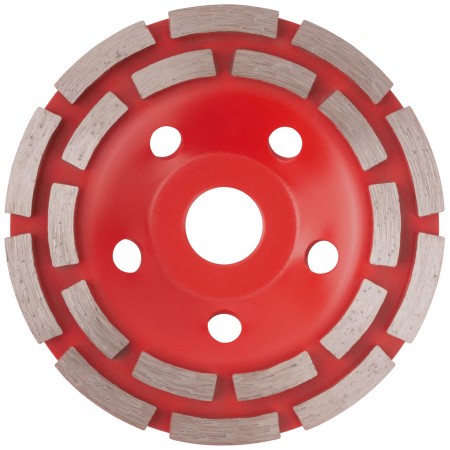 2 ряда сегментов. Для углошлифовальных машин. Посадочный диаметр 22,2 мм. Для работ по бетону, граниту, мрамору и другим материалам. Материал: высокоуглеродистая сталь, режущая кромка с техническими алмазами.