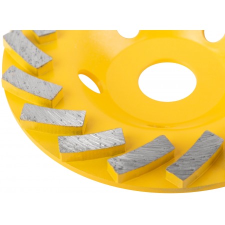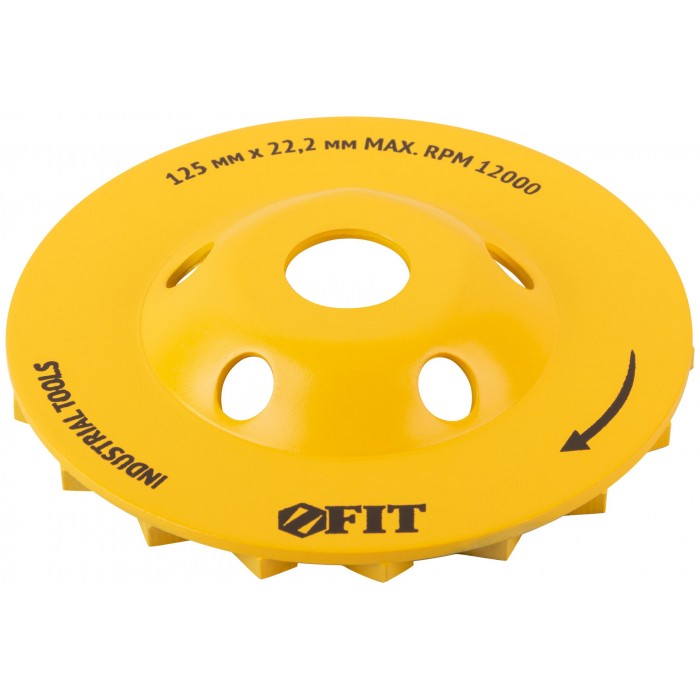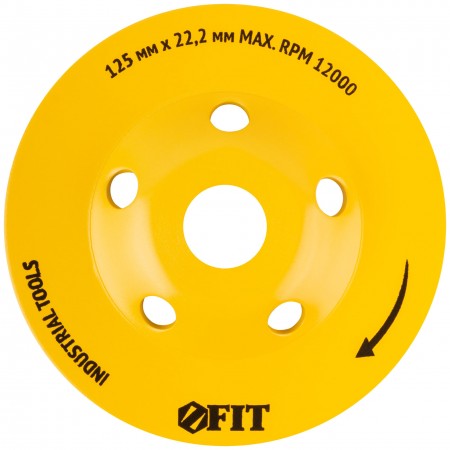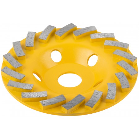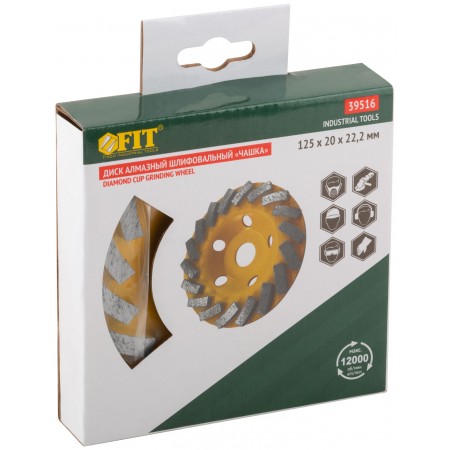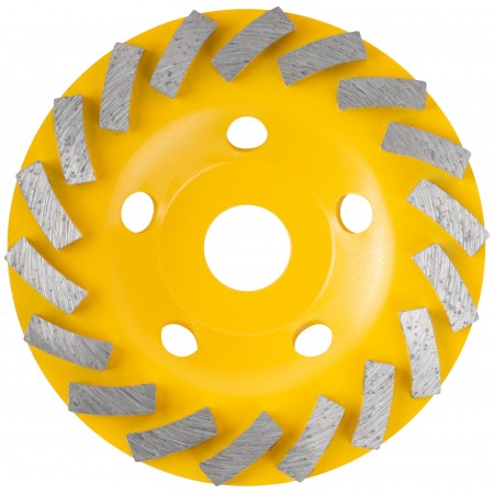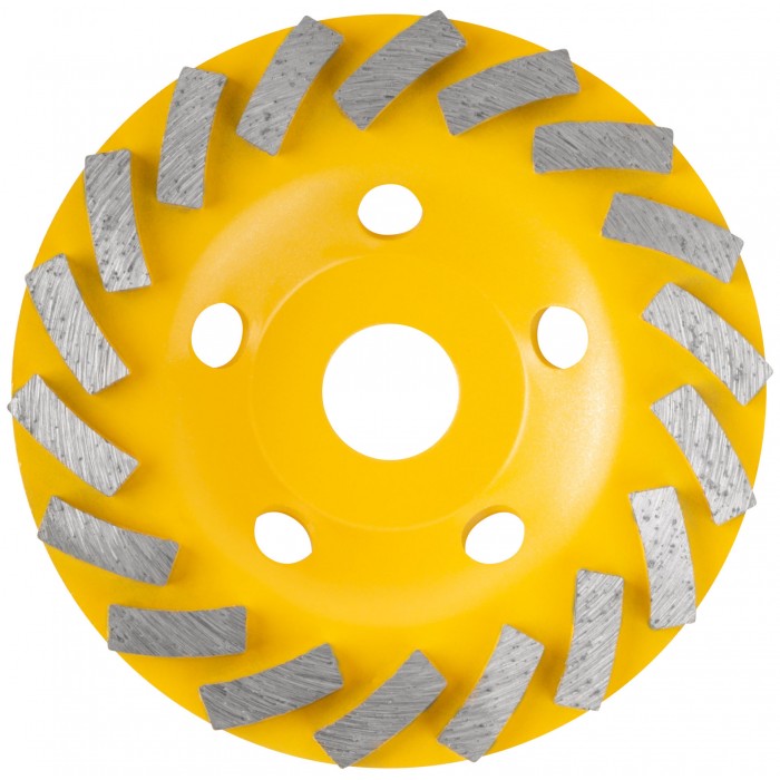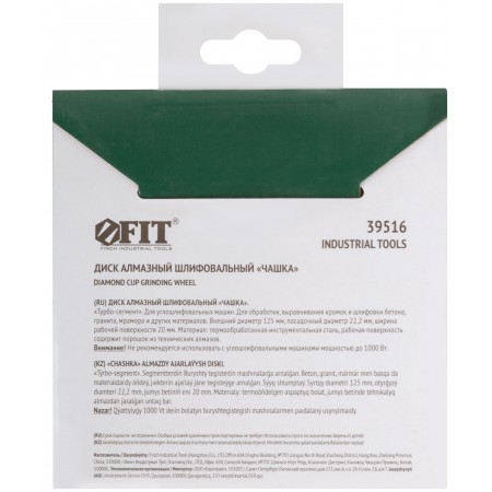 ''Турбо-сегмент''. Для углошлифовальных машин. Посадочный диаметр 22,2 мм. Удобен для выравнивания кромки, шлифовки, и полировки бетона, гранита, мрамора и аналогичных строительных материалов. Подходит для тонкой обработки. Материал: инструментальная сталь, режущая кромка содержит порошок из технических алмазов.