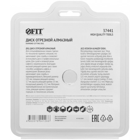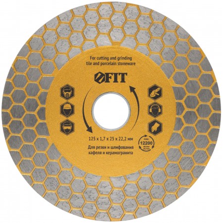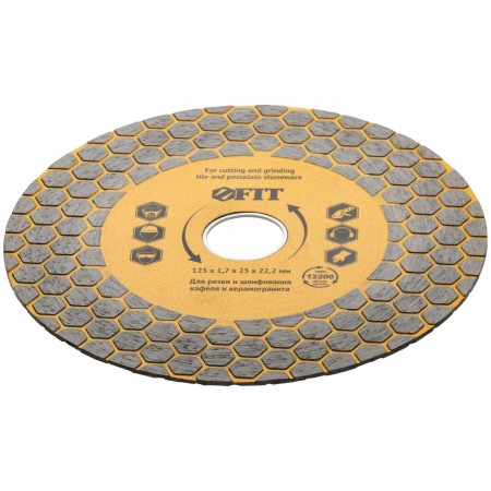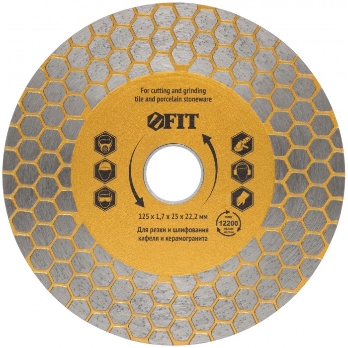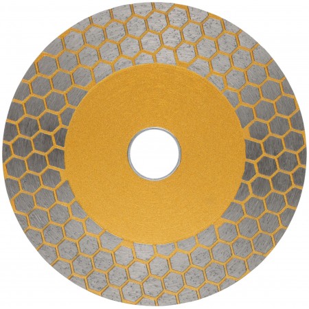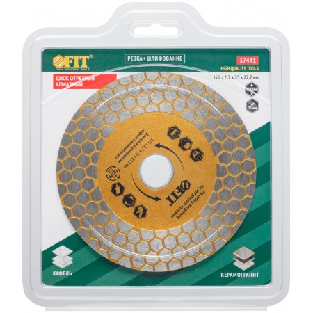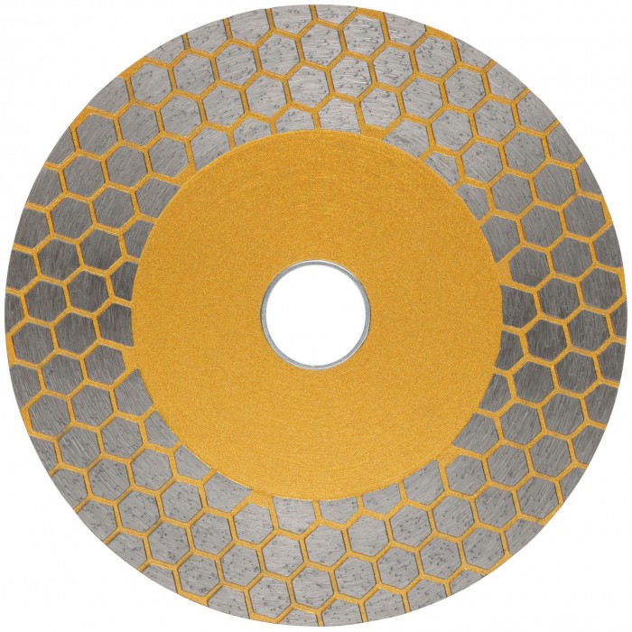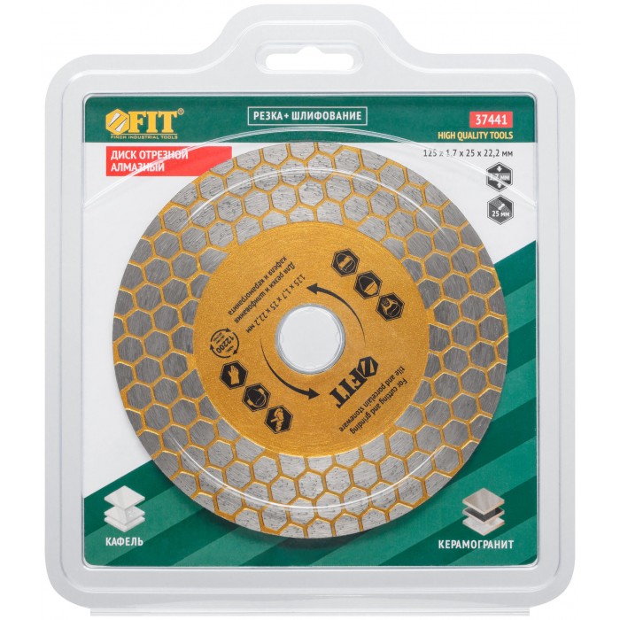 Для сухой и влажной резки кафеля и керамогранита. Благодаря высокой режущей кромке диск также способен шлифовать камень и керамогранит. Изготовлен по технологии горячего спекания. Высота алмазной режущей кромки 25 мм. Посадочный диаметр 22,2 мм. Материал: инструментальная сталь, режущая кромка содержит порошок из техническхи алмазов. Упаковка: блистер.
