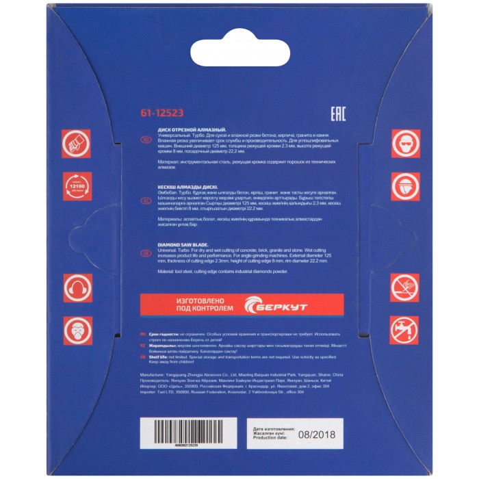 Универсальный диск, для сухой и влажной резки бетона, кирпича, гранита и камня. Усиленная конструкция. Посадочный диаметр 22,2 мм. Инструментальная сталь, режущая кромка содержит порошок из технических алмазов. Упаковка: блистер.