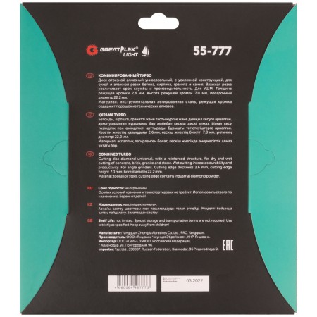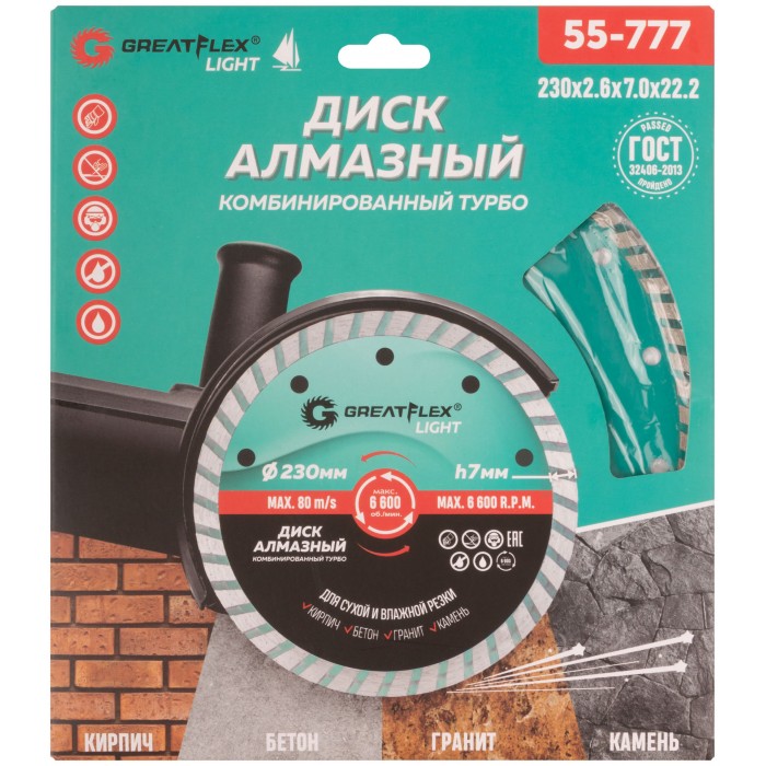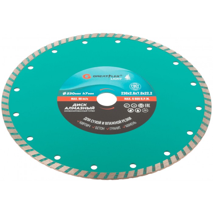 Диск отрезной алмазный комбинированный турбо GreatFlex Light, 230 x 2.6 x 7.0 x 22.2 мм (55-777)