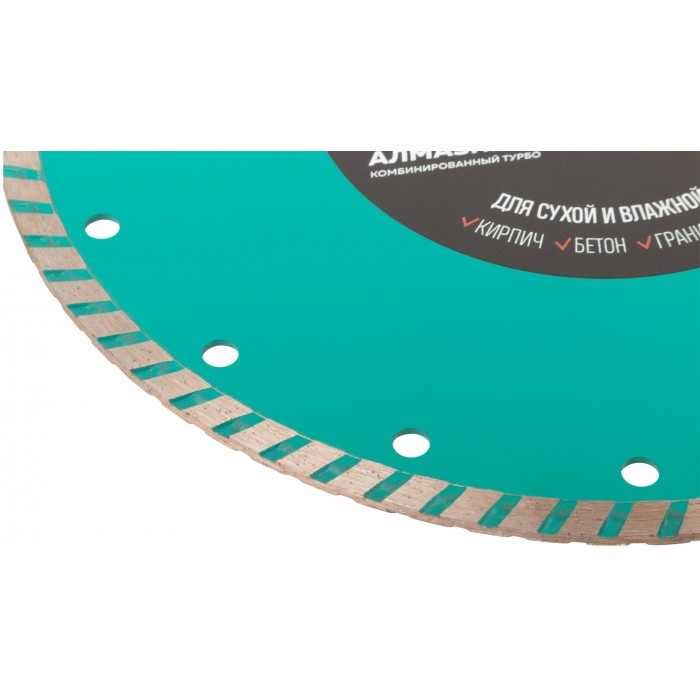 Отрезной. Комбинированный Турбо. Универсальный диск, для сухой и влажной резки бетона, кирпича, гранита и камня. Усиленная конструкция. Посадочный диаметр 22,2 мм. Высота алмазных сегментов 7 мм. Инструментальная сталь, порошок из тех. алмазов. Упаковка: картонный конверт.