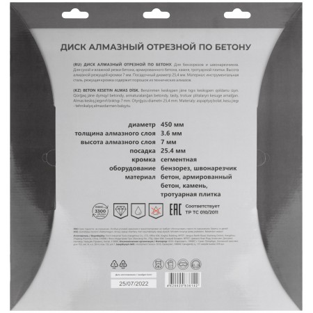Диск отрезной алмазный по бетону, 450 х 3.6 х 7 х 25.4 мм (37333М)