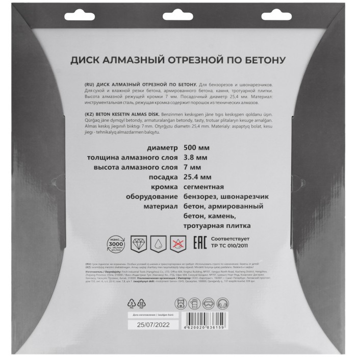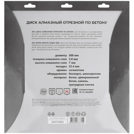 Для бензорезов и швонарезчиков. Для «сухой» и «влажной» резки бетона, армированного бетона, камня, тротуарной плитки. Высота алмазной режущей кромки 7 мм. Посадочный диаметр 25,4 мм. Материал: инструментальная сталь, режущая кромка содержит порошок из технических алмазов. Упаковка: картонный конверт.