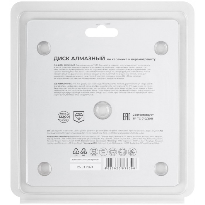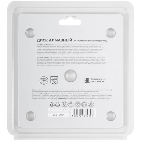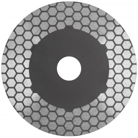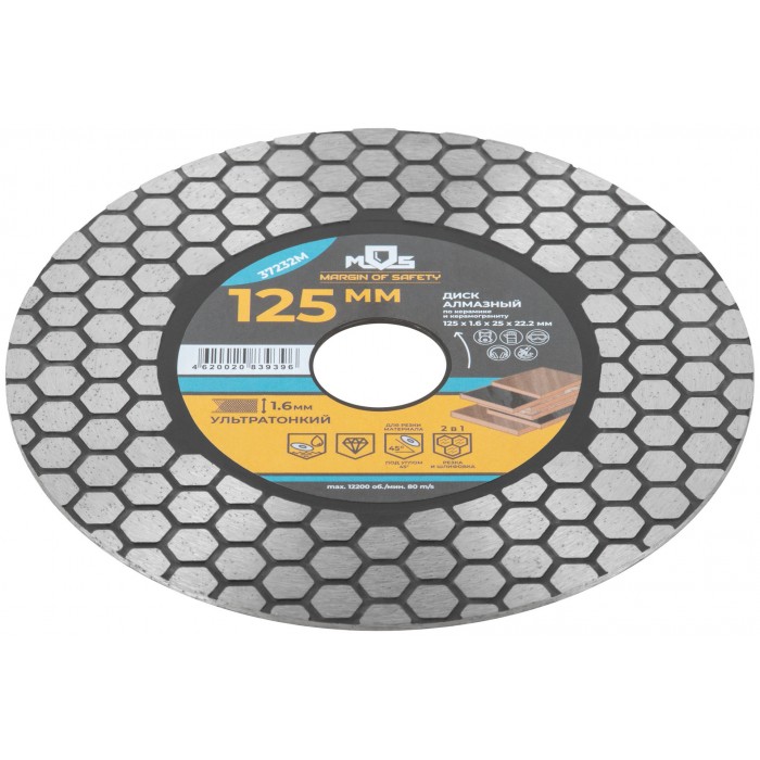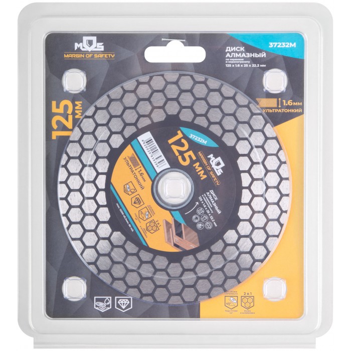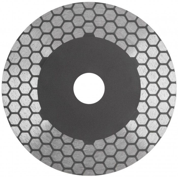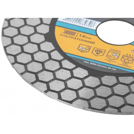 Для «сухой» и «влажной» резки керамики и керамогранита, в том числе и под углом 45° (тип резки «Заусовка»). Толщина диска 1,6 мм. Алмазный слой выполнен в виде сот, что армирует диск и обеспечивает точный прямолинейный рез. Двухсторонняя алмазная режущая кромка высотой 25 мм придаёт резу мягкость, также даёт возможность подшлифовать кромку торца плитки. Предназначен для использования с УШМ. Материал: инструментальная сталь, режущая кромка содержит порошок из технических алмазов. Упаковка: двойной блистер.