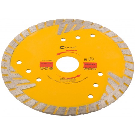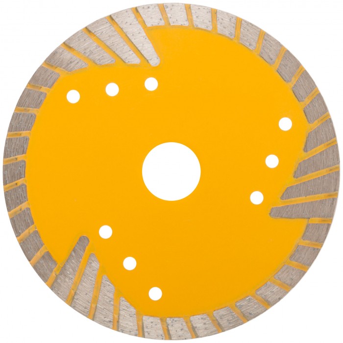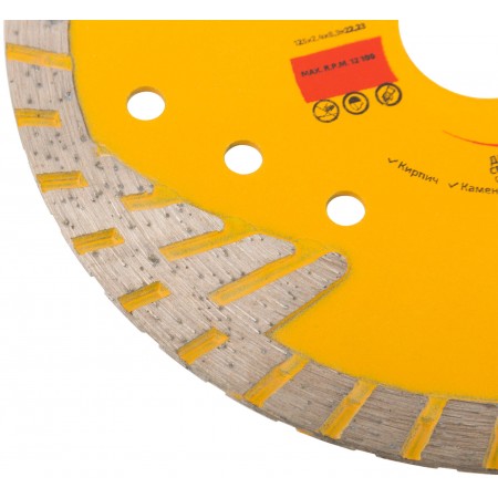 Для резки армированного бетона, керамической плитки, гранита, кирпича, камня. Защитные сектора диска обеспечивают защиту режущего слоя от бокового износа. Изготовлен методом горячего прессования, что обеспечивает большую твердость и более длительный срок службы диска в сравнении с методом холодного прессования. Диски характеризуются повышенной концентрацией алмазов, улучшенным качеством алмазных зерен и оптимально подобранной металлической связкой. Эти преимущества обеспечивают высокую производительность и увеличенный срок службы. Материал: инструментальная сталь, режущая кромка содержит порошок из технических алмазов. Упаковка: двойной блистер.