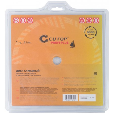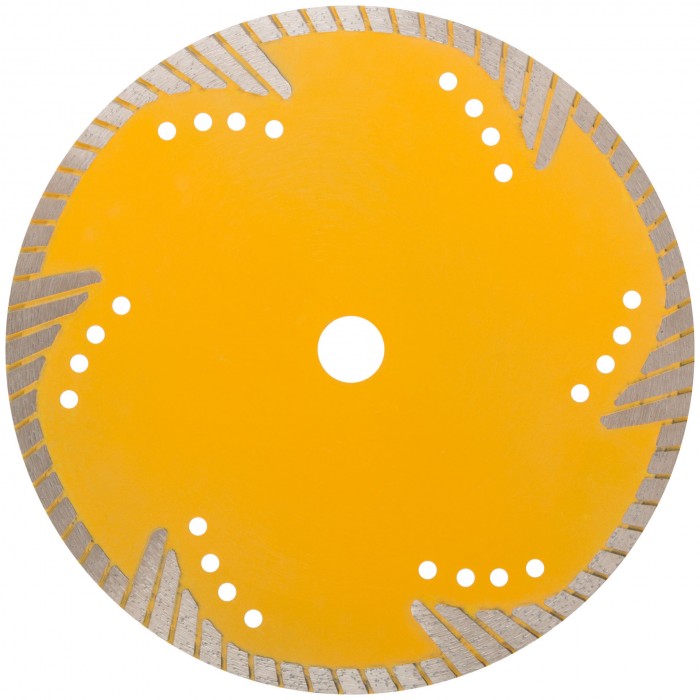 Для резки армированного бетона, керамической плитки, гранита, кирпича, камня. Защитные сектора диска обеспечивают защиту режущего слоя от бокового износа. Изготовлен методом горячего прессования, что обеспечивает большую твердость и более длительный срок службы диска в сравнении с методом холодного прессования. Диски характеризуются повышенной концентрацией алмазов, улучшенным качеством алмазных зерен и оптимально подобранной металлической связкой. Эти преимущества обеспечивают высокую производительность и увеличенный срок службы. Материал: инструментальная сталь, режущая кромка содержит порошок из технических алмазов. Упаковка: двойной блистер.