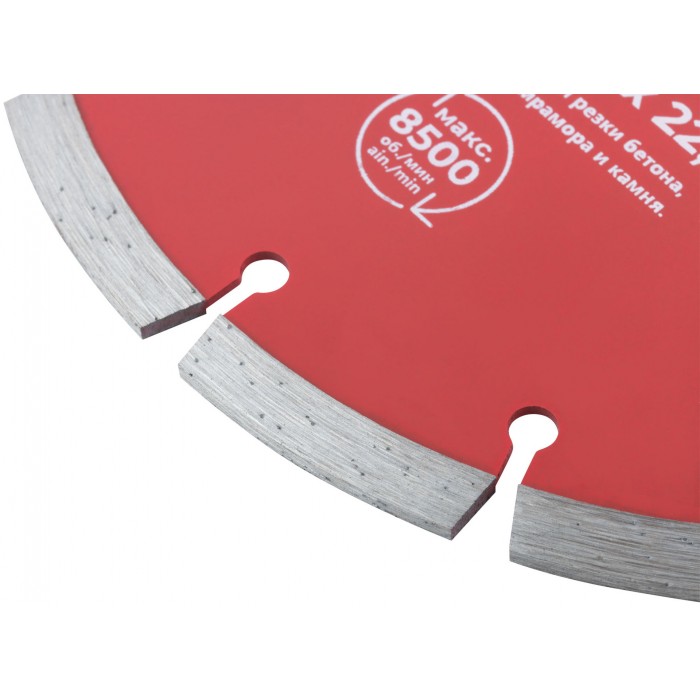 Сегментный. Универсальный. Для сухой и влажной резки бетона, кирпича, гранита, мрамора и камня. Высота алмазной режущей кромки 7 мм. Посадочный диаметр 22,2 мм. Материал: инструментальная сталь, режущая кромка содержит порошок из технических алмазов. Упаковка: картонный конверт.