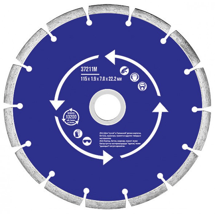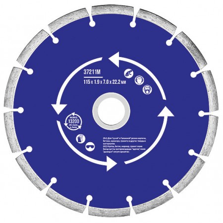 Сегментный. Для использования с УШМ . Посадочный диаметр 22,2мм. Для ''сухой'' и ''влажной''резки кирпича, бетона, мрамора,гранита и других твердых материалов. Сегментная режущая кромка обеспечивает охлаждение диска в процессе работы, предотвращая его перегрев. Материал: инструментальная сталь, режущая кромка-расплав с техническими алмазами. Уп: Блистер