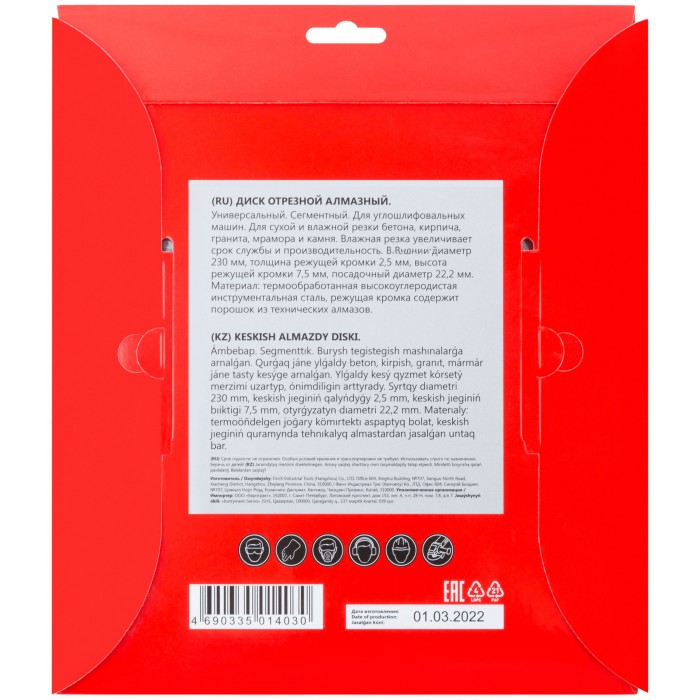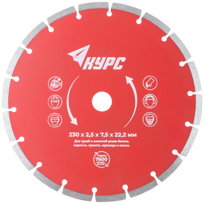 Сегментный. Универсальный. Для сухой и влажной резки бетона, кирпича, гранита, мрамора и камня. Высота алмазной режущей кромки 7 мм. Посадочный диаметр 22,2 мм. Материал: инструментальная сталь, режущая кромка содержит порошок из технических алмазов. Упаковка: картонный конверт.