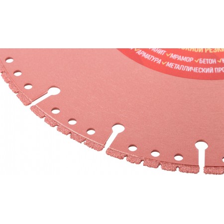 Высокая плотность расположения алмазов в режущем слое позволяет использовать диск для резки металлического профиля, арматуры, бетона, кирпича, гранита, мрамора, дерева. Отличные результаты диск показывает при резке тонколистового металла, кровли. Изготовлен методом горячего прессования, что обеспечивает большую твердость и более длительный срок службы диска в сравнении с методом холодного прессования. Материал: высокоуглеродистая термообработанная инструментальная сталь, режущая кромка содержит порошок из технических алмазов. Упаковка: блистер.