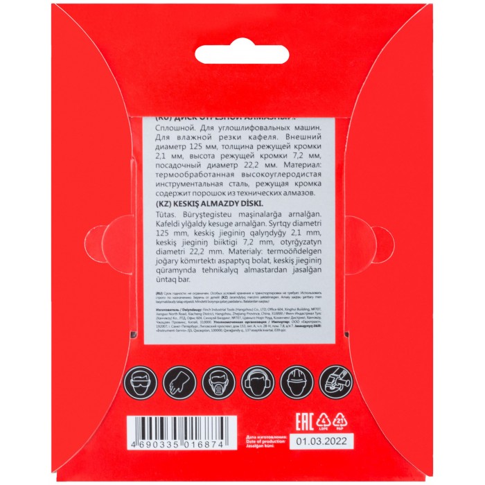 Сплошной. Для влажной резки кафеля. Высота алмазной режущей кромки 6 мм. Посадочный диаметр 22,2 мм. Материал: инструментальная сталь, режущая кромка содержит порошок из технических алмазов. Упаковка: картонный конверт.
