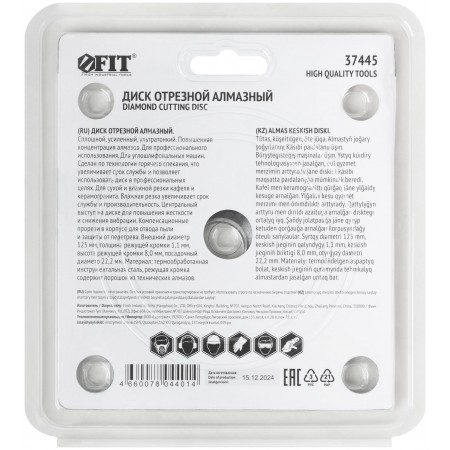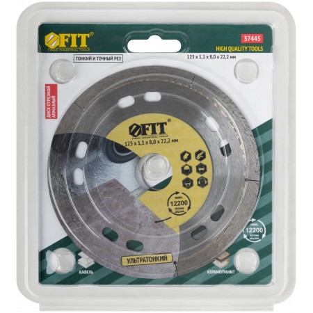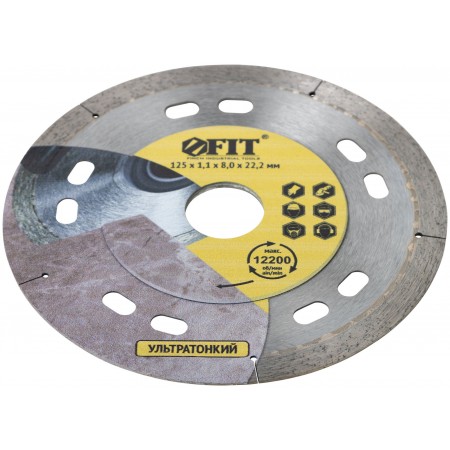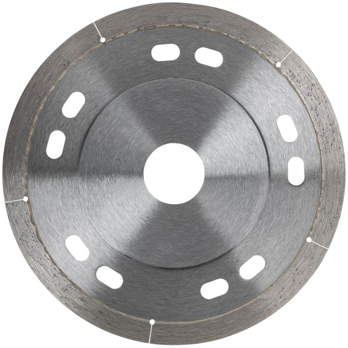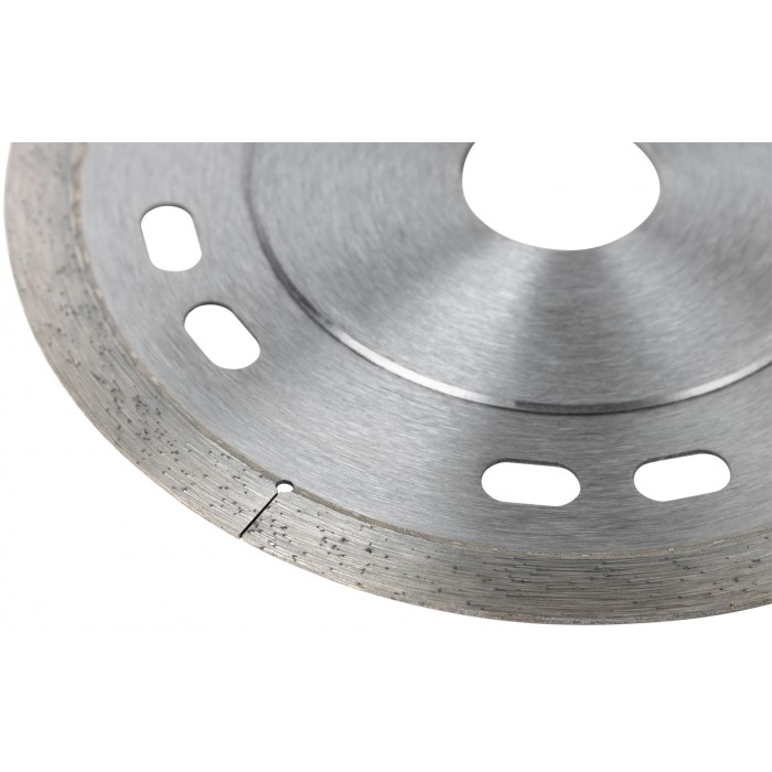 Усиленный. Для сухой и влажной резки кафеля и керамогранита. Ультратонкий рез. Изготовлен по технологии горячего спекания. Повышенная концентрация алмазов. Алмазная режущая кромка высотой 8 мм и толщиной 1,1 мм; толщина диска 0,8 мм. Предназначен для углошлифовальных машин. Посадочный диаметр 22,2 мм. Материал: инструментальная сталь, режущая кромка содержит порошок из технических алмазов. Упаковка: блистер.