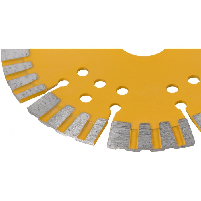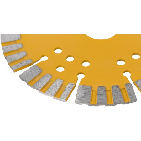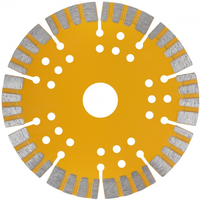 Для резки камня, кирпича, гранита, армированного бетона. Перфорация корпуса диска способствует дополнительному охлаждению. Изготовлен методом горячего прессования, что обеспечивает большую твердость и более длительный срок службы диска в сравнении с методом холодного прессования. Диски характеризуются повышенной концентрацией алмазов, улучшенным качеством алмазных зерен и оптимально подобранной металлической связкой. Эти преимущества обеспечивают высокую производительность и увеличенный срок службы. Материал: инструментальная сталь, режущая кромка содержит порошок из технических алмазов. Упаковка: блистер.