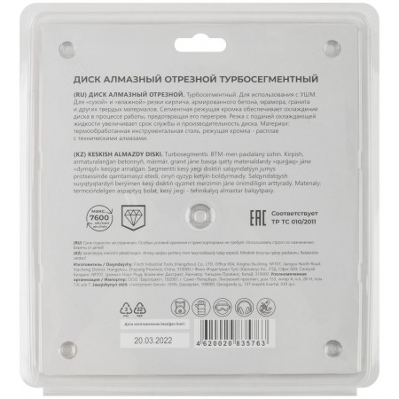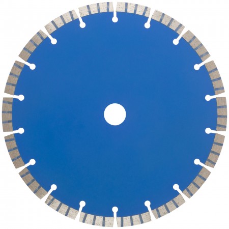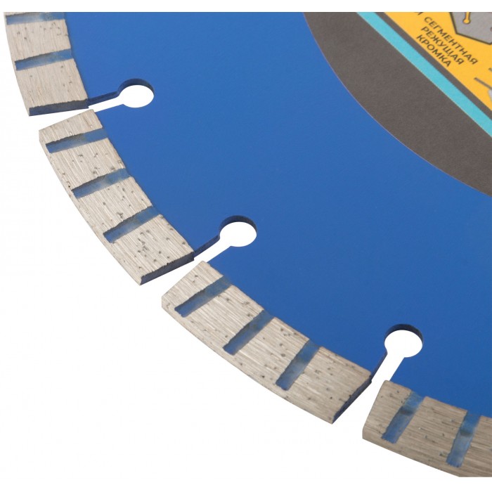 Турбосегментный. Для использования с УШМ. Посадочный диаметр 22,2 мм. Для «сухой» и «влажной» резки кирпича, бетона, армированного бетона, мрамора, гранита и других твердых материалов. Сегментная алмазная режущая кромка, с ''турбо'' профилем высотой 10 мм, увеличивает скорость реза и способствует более эффективному удалению отработанного материала, предотвращая перегрев диска. Материал: инструментальная сталь, режущая кромка - расплав с техническими алмазами. Упаковка: блистер.