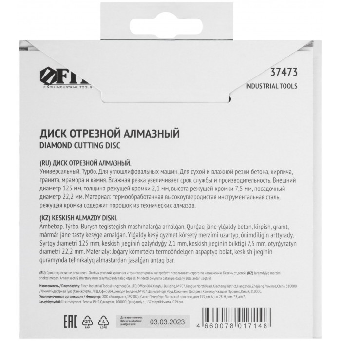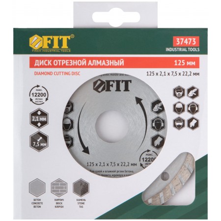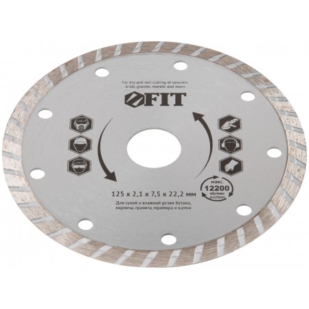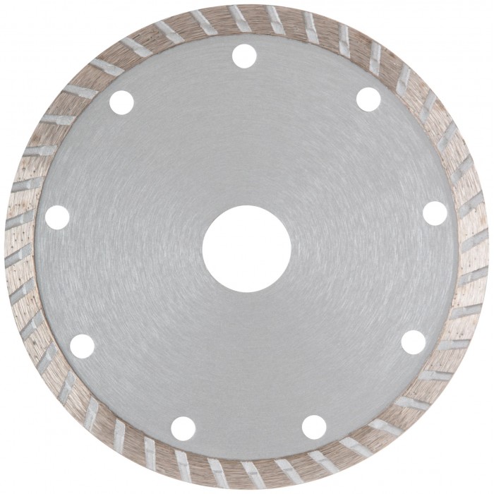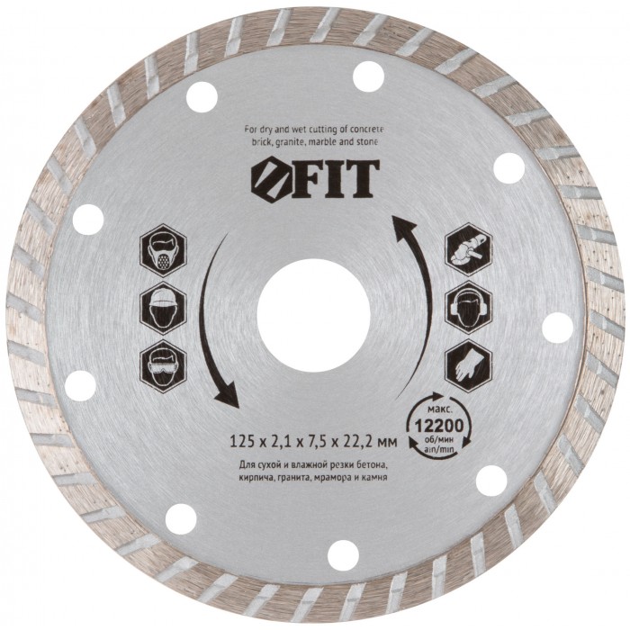 «Турбо». Для сухой и влажной резки. Универсальный. Применяется для резки бетона, кирпича, гранита, мрамора и камня. Высота алмазной режущей кромки 7,5 мм. Посадочный диаметр 22,2 мм. Материал: высококачественная инструментальная сталь, режущая кромка содержит порошок из технических алмазов. Упаковка: картонный конверт.