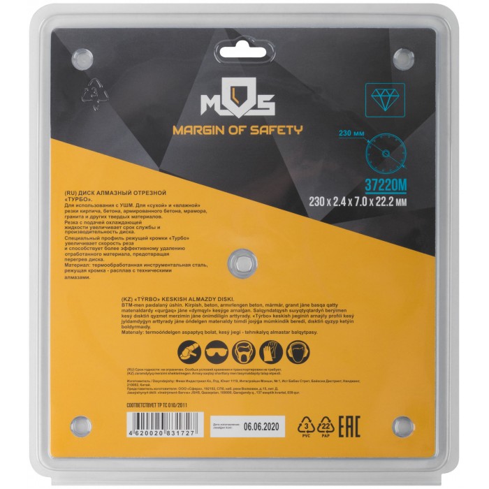 ''Турбо''. Для использования с УШМ. Посадочный диаметр 22,2. Для ''сухой'' и ''влажной''резки кирпича, армированного бетона, мрамора, гранита и других твердых материалов. Специальный профиль режущей кромки ''Турбо''Увеличивает скорость реза и способствует более эффективному удалению отработанного материала, предотвращая перегрев диска. Материал: инструментальная сталь, режущая кромка-расплав с техническими алмазами. Уп: Блистер