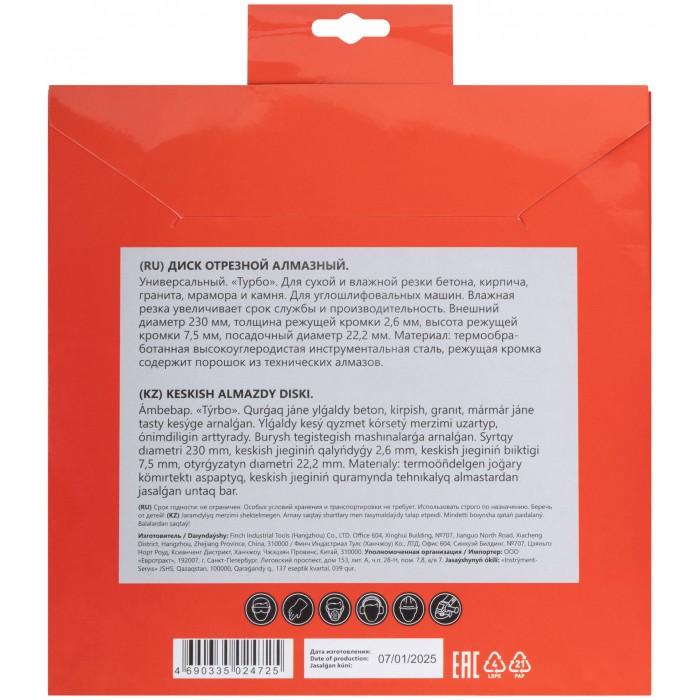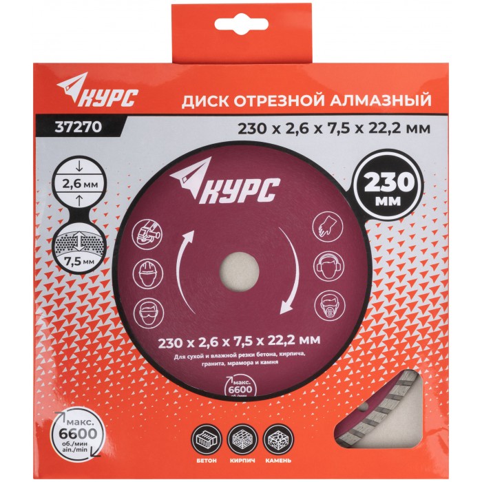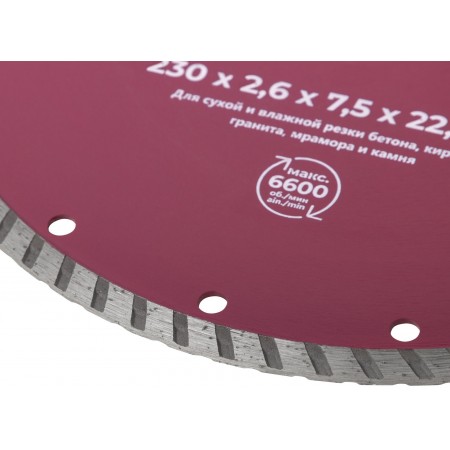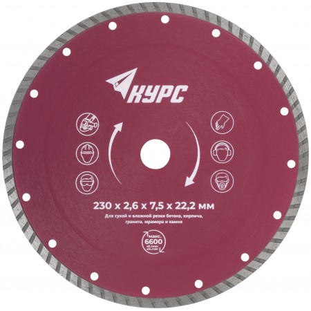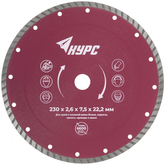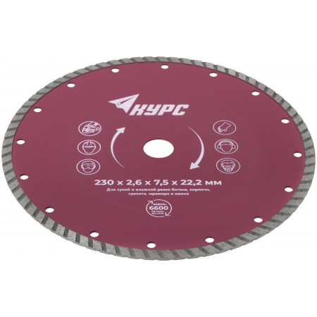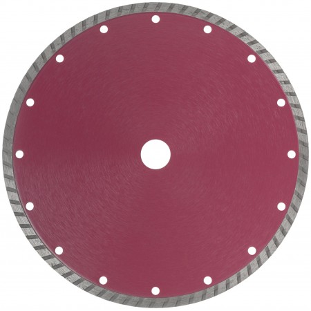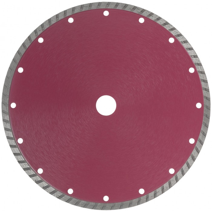 «Турбо». Универсальный. Для сухой и влажной резки бетона, кирпича, мрамора и камня. Высота алмазной режущей кромки 7 мм. Посадочный диаметр 22,2 мм. Материал: инструментальная сталь, режущая кромка содержит порошок из технических алмазов.