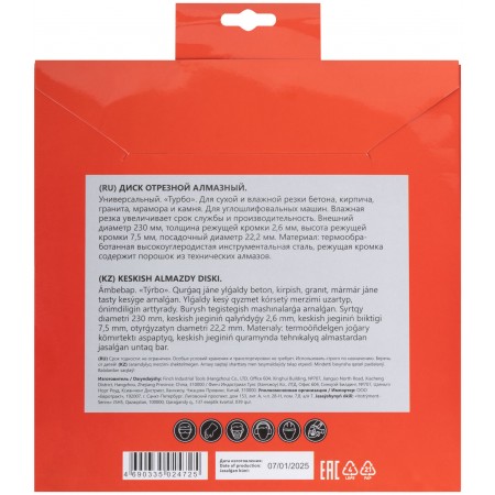 Диск отрезной алмазный "турбо" (сухая и влажная резка) 230х2,4х7,0х22,2 мм (37270)
