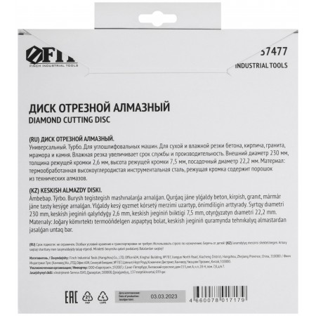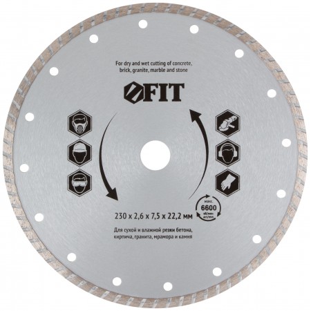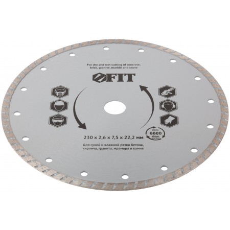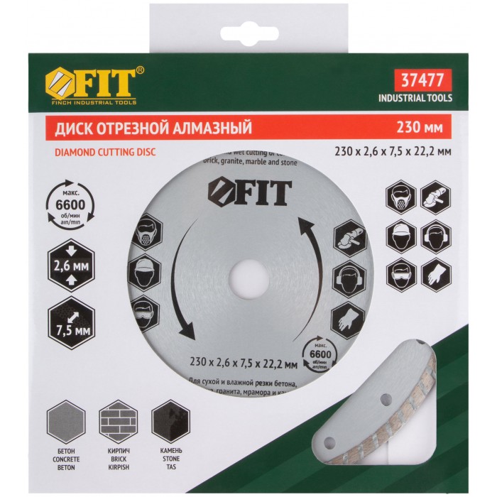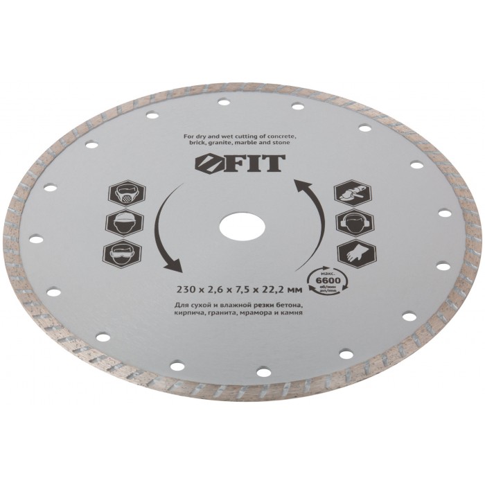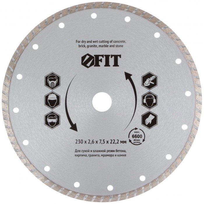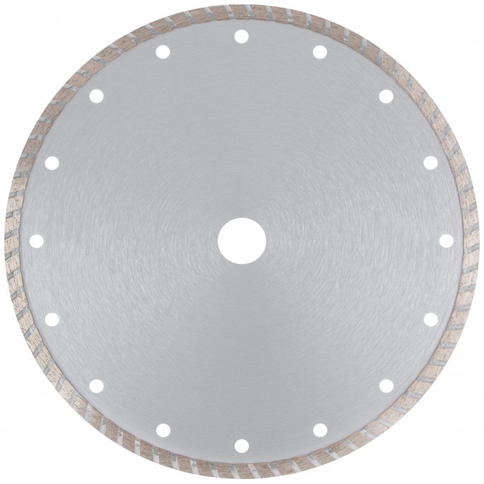 «Турбо». Для сухой и влажной резки. Универсальный. Применяется для резки бетона, кирпича, гранита, мрамора и камня. Высота алмазной режущей кромки 7,5 мм. Посадочный диаметр 22,2 мм. Материал: высококачественная инструментальная сталь, режущая кромка содержит порошок из технических алмазов. Упаковка: картонный конверт.