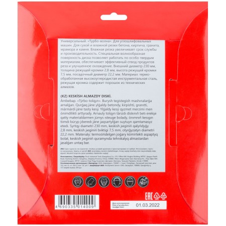 «Турбо-волна». Универсальный. Для сухой и влажной резки бетона, кирпича, гранита, мрамора и камня. Усиленная конструкция. Высота алмазной режущей кромки 7 мм. Посадочный диаметр 22,2 мм. Материал: инструментальная сталь, режущая кромка содержит порошок из технических алмазов. Упаковка: картонный конверт.
