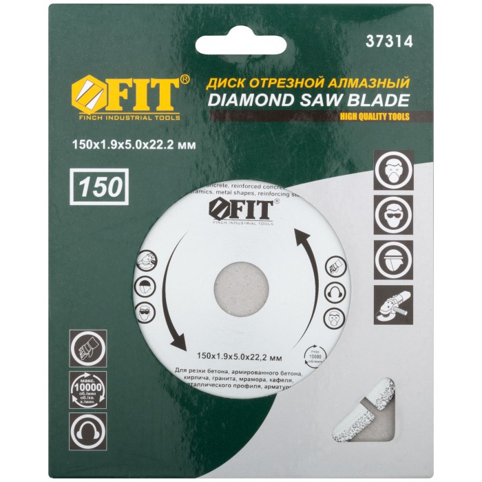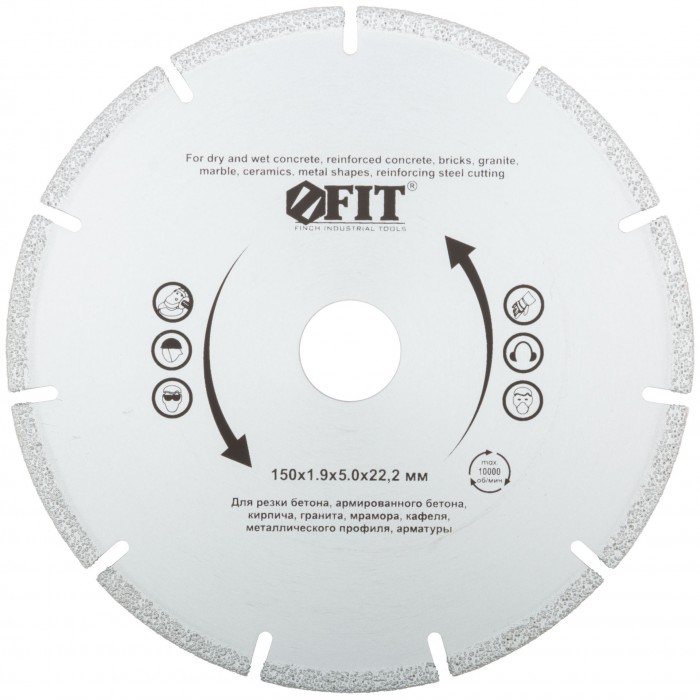 Универсальный сегментный. Для сухой и влажной резки. Высокая плотность расположения алмазов в режущем слое позволяет использовать диск для резки бетона, кирпича, гранита, мрамора, металлического профиля, арматуры. Посадочный диаметр 22,2 мм. Материал: высокоуглеродистая термообработанная инструментальная сталь, режущая кромка содержит порошок из технических алмазов. Упаковка: картонный конверт.
