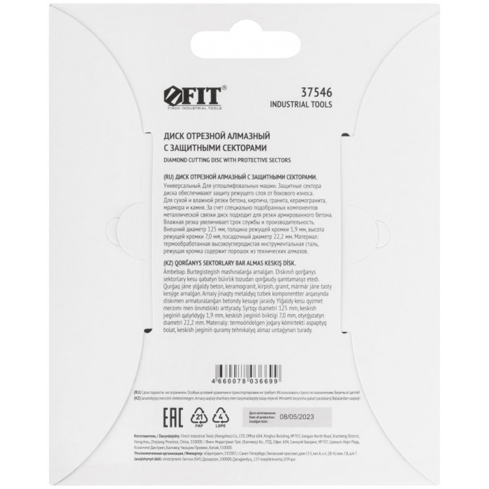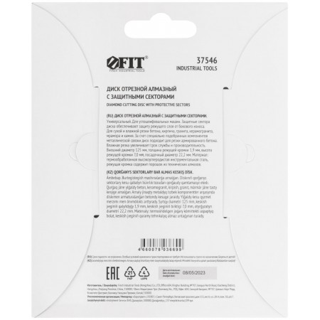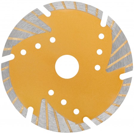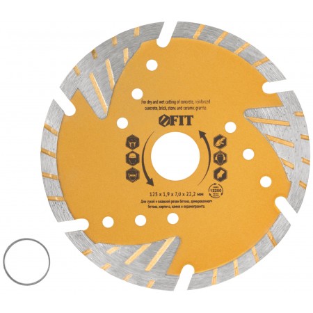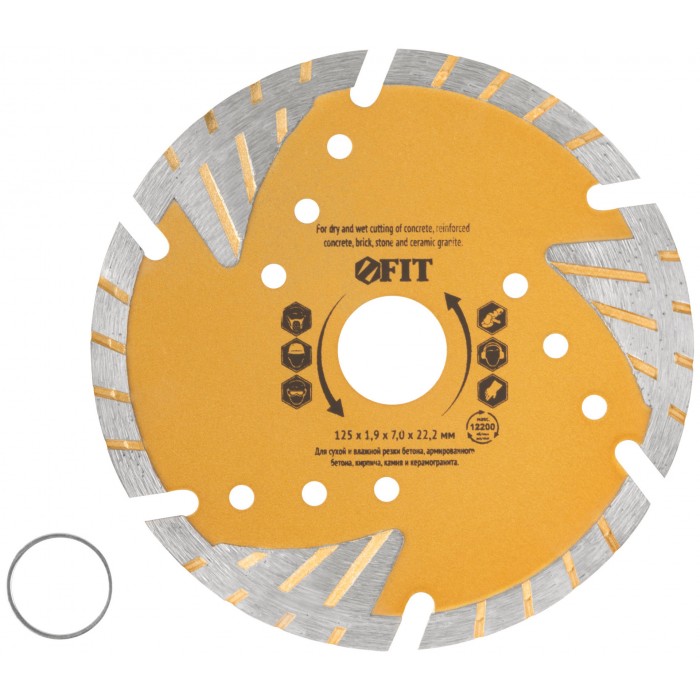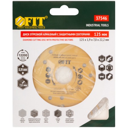 С защитными секторами. Универсальный. Для сухой и влажной резки бетона, кирпича, гранита, керамогранита, мрамора и камня. За счет специально подобранных компонентов металлической связки диск подходит для резки армированного бетона. Защитные сектора диска обеспечивают защиту режущего слоя от бокового износа. Высота алмазной режущей кромки 37546 - 7,0 мм, 37549 - 7,5 мм. Посадочный диаметр 22,2 мм. Материал: высокоуглеродистая инструментальная сталь, режущая кромка содержит порошок из технических алмазов. Упаковка: картонный конверт.