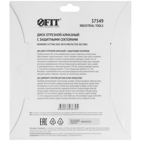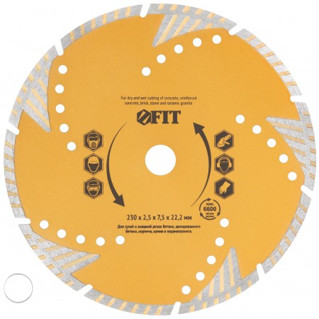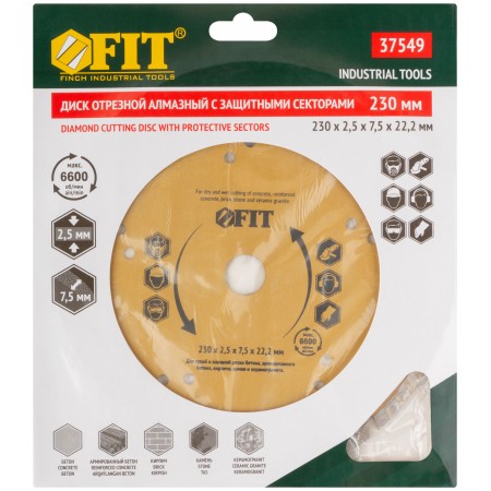 С защитными секторами. Универсальный. Для сухой и влажной резки бетона, кирпича, гранита, керамогранита, мрамора и камня. За счет специально подобранных компонентов металлической связки диск подходит для резки армированного бетона. Защитные сектора диска обеспечивают защиту режущего слоя от бокового износа. Высота алмазной режущей кромки 37546 - 7,0 мм, 37549 - 7,5 мм. Посадочный диаметр 22,2 мм. Материал: высокоуглеродистая инструментальная сталь, режущая кромка содержит порошок из технических алмазов. Упаковка: картонный конверт.
