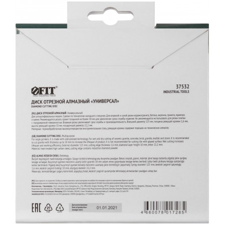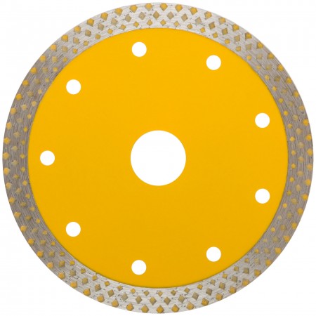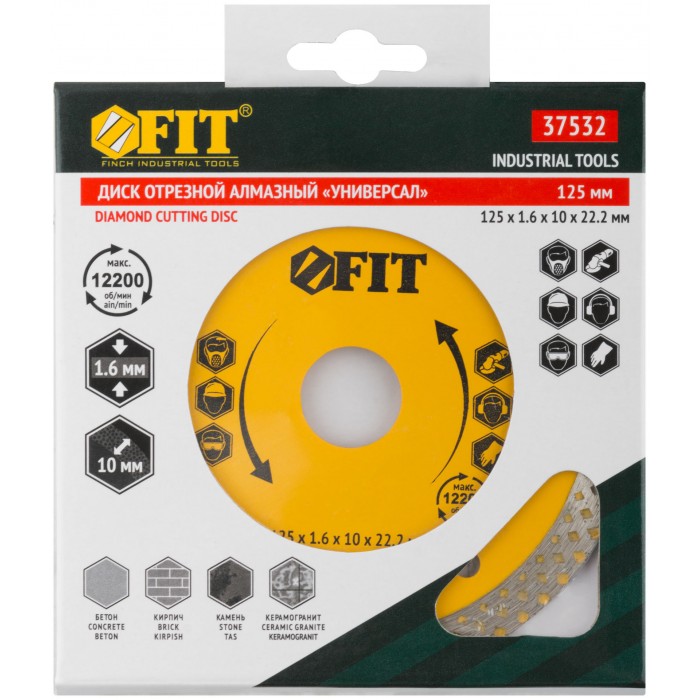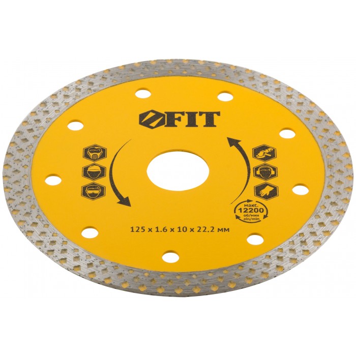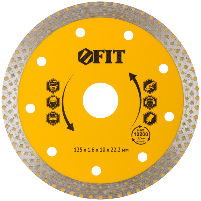 Универсальный. Для влажной и сухой резки керамогранита, бетона, кирпича, гранита, мрамора и камня. Посадочный диаметр 22,2 мм. Высота алмазной кромки 10 мм. Материал: инструментальная сталь, режущая кромка содержит порошок из технических алмазов.