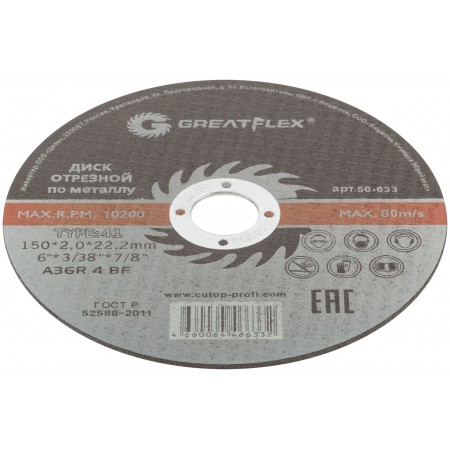 Диск отрезной по металлу Greatflex T41-150 х 2,0 х 22.2 мм, класс Master (50-633)