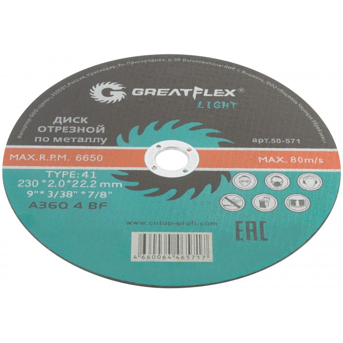 Диск отрезной по металлу Greatflex T41-230 х 2,0 х 22,2 мм, класс Light (50-571)