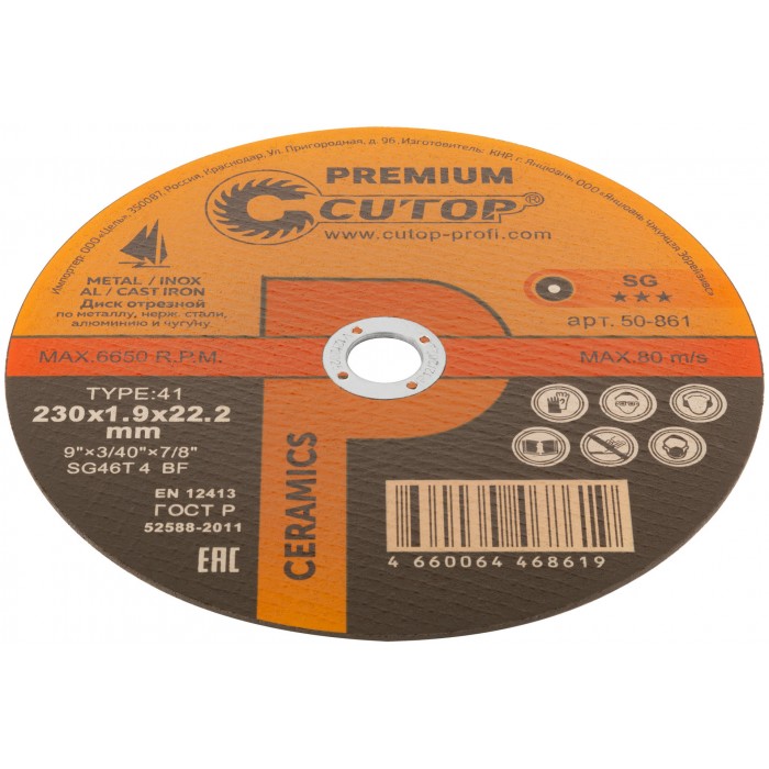 Диск отрезной по металлу, нерж.стали и чугуну Cutop CERAMICS, серия Premium, T41-230 х 1,9 х 22,2 мм (50-861)