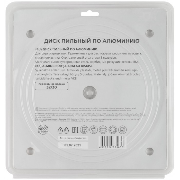По алюминию и пластику. Зубья из твердого сплава ВК8 (карбид вольфрама). Корпус из легированной высокоуглеродистой стали. Угол атаки -5°. Упаковка: блистер.