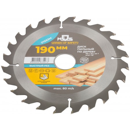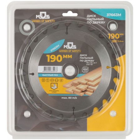 Диск пильный для циркулярных пил по дереву 190 х 30 х 24T + 2 кольца: 30/20 и 20/16 мм (37663М)
