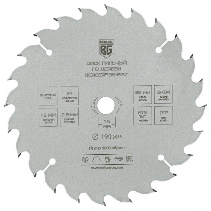 Диск пильный по дереву и ДСП, быстрый рез (190x16x24z, 2.6/1.8 мм, ATB 10°, атака 20°) BERGER BG1637