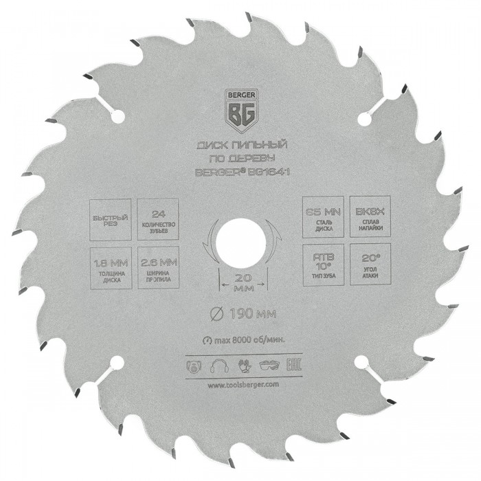 Диск пильный по дереву и ДСП, быстрый рез (190x20/16x24z, 2.6/1.8 мм, ATB 10°, атака 20°) BERGER BG1641