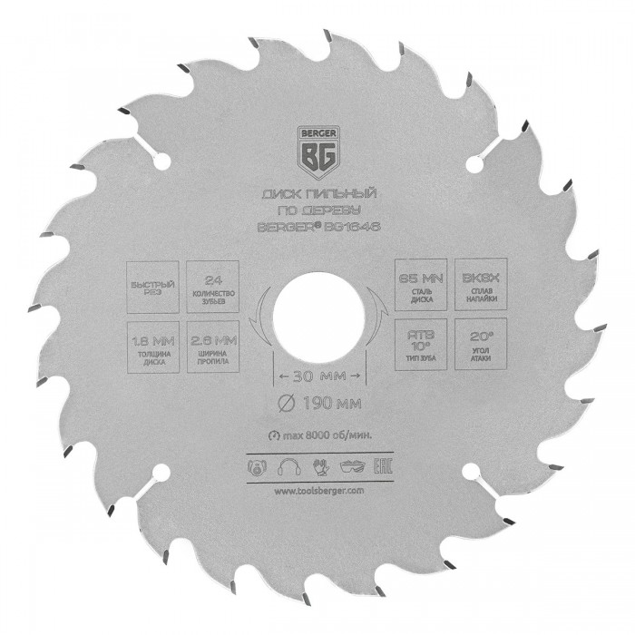Диск пильный по дереву и ДСП, быстрый рез (190x30/25.4/20/16x24z, 2.6/1.8 мм, ATB 10°, атака 20°) BERGER BG1646