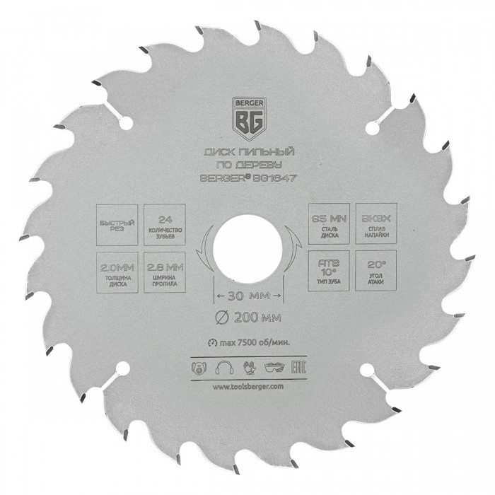 Диск пильный по дереву и ДСП, быстрый рез (200x30/25.4/20/16x24z, 2.8/2.0 мм, ATB 10°, атака 20°) BERGER BG1647