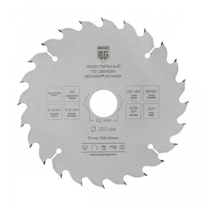 Диск пильный по дереву и ДСП, быстрый рез (200x32/30/25.4/20x24z, 2.8/2.0 мм, ATB 10°, атака 20°) BERGER BG1659